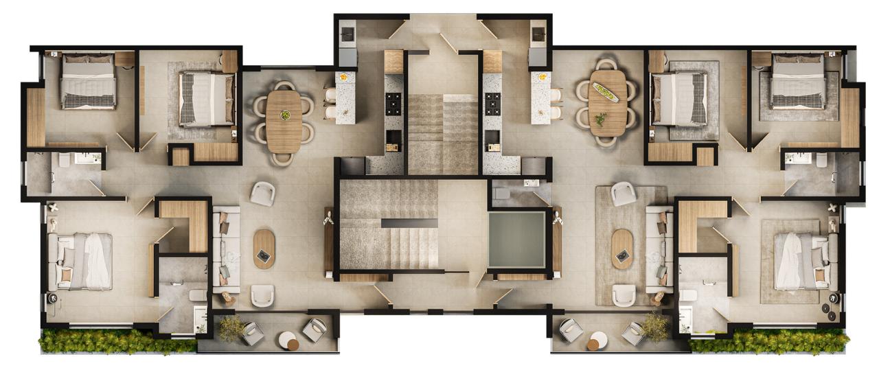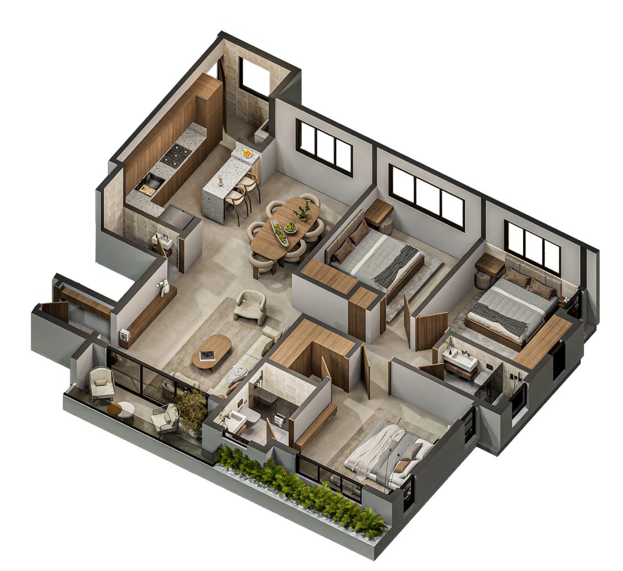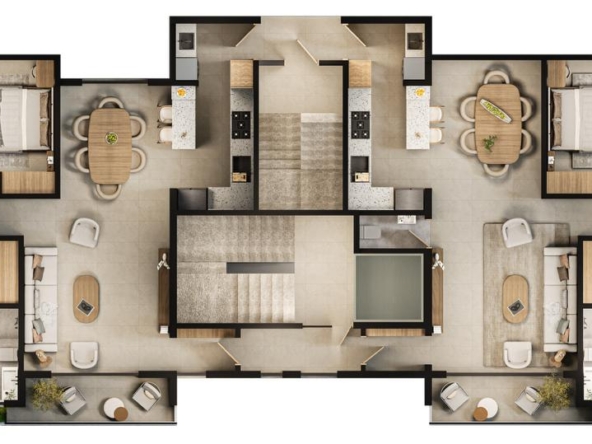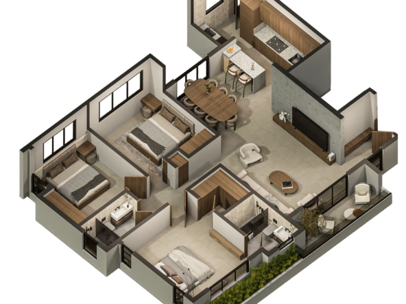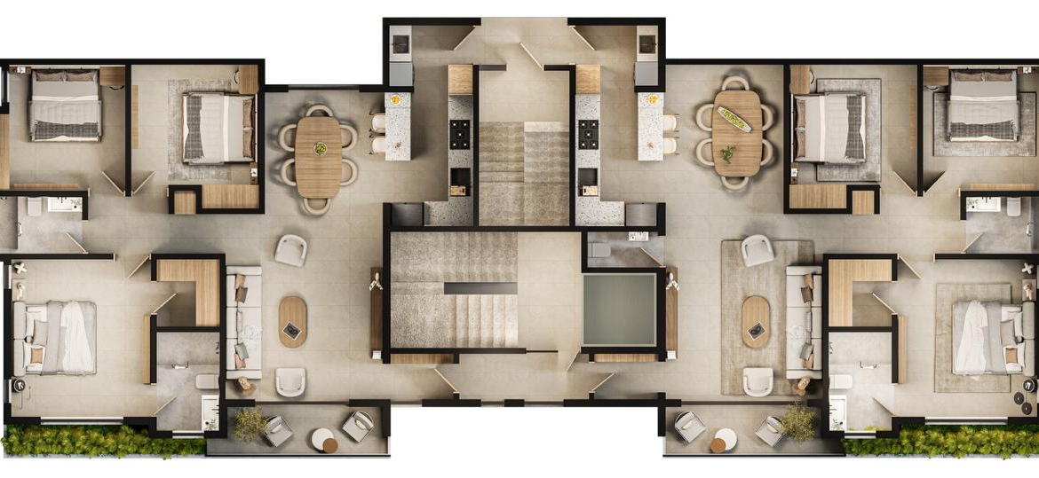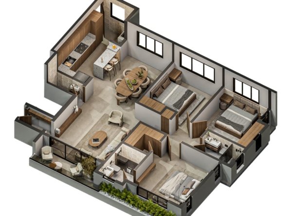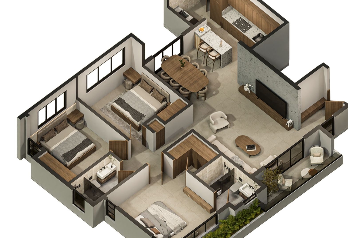 Las Torres residenciales TREO II, es un exclusivo proyecto residencial diseñado para ofrecer un estilo de vida de lujo y tranquilidad en un entorno armónico con la naturaleza. El proyecto se distingue por su composición arquitectónica, presentando cuatro imponentes torres residenciales de diseño contemporáneo, caracterizadas por sus fachadas modernas con toques de color tierra y amplios balcones adornados con vegetación, que integran la vida exterior con el confort interior.